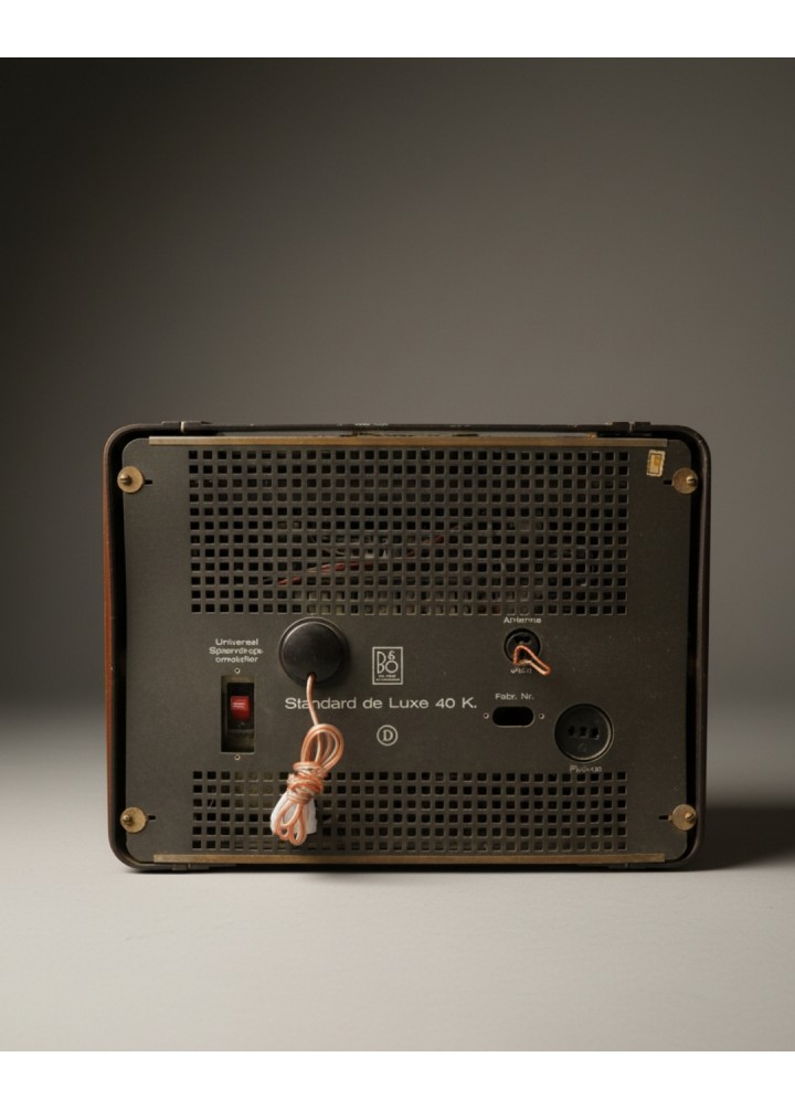 "Standard de Luxe" serisi, o dönemde B&O'nun erişilebilir lüks anlayışını yansıtırken, "40 K" ibaresindeki K harfi (Kortbølge = Kısa Dalga olabileceği gibi, genellikle K Transistör anlamına gelir) transistör teknolojisine geçişi işaret eder. Arka paneldeki "Universal Spændingsomskifter" (Evrensel Voltaj Anahtarı) detayı, radyonun farklı coğrafyalarda kullanıma ve hem şebeke hem de pil ile çalışmaya uygun tasarlandığını gösterir; bu da onun modern bir taşınabilir sınıfı hedeflediğini kanıtlar.