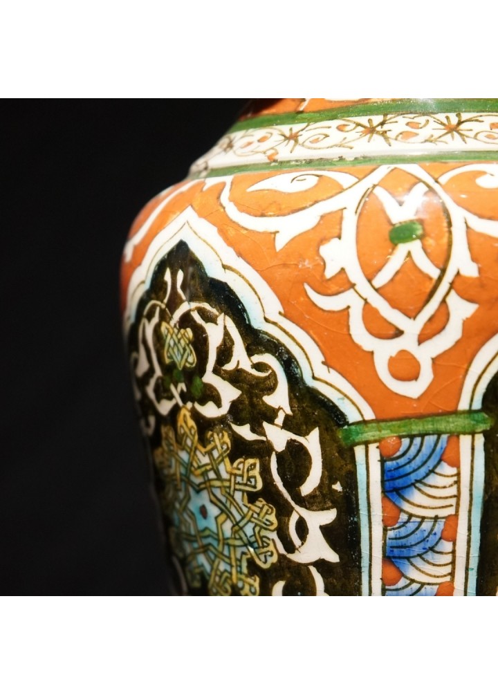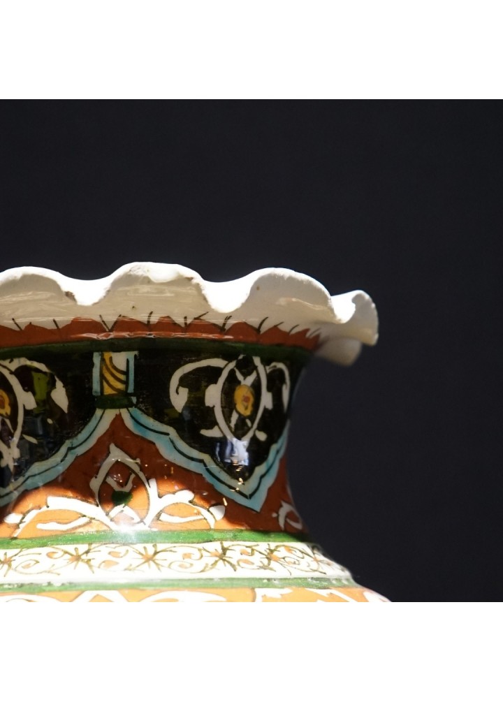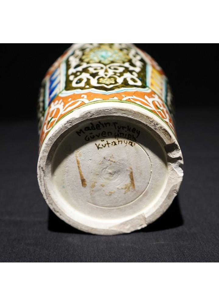 Vazonun turuncu, kahverengi, beyaz ve mavi gibi zengin renk paleti, karmaşık ve iç içe geçmiş motiflerle göz alıcı bir kompozisyon oluşturur. Merkezdeki dikey paneller, İslam sanatının geometrik desenlerini anımsatırken, etrafındaki kıvrımlı hatlar ve stilize edilmiş bitkisel motifler, vazoya dinamik bir hava katar. Vazonun dalgalı ağız kısmı, el işçiliğinin benzersizliğini vurgular. Altında bulunan "Güvenç Kütahya" imzası, eserin usta bir zanaatkar tarafından özenle yapıldığını ve koleksiyon değeri taşıdığını gösterir.