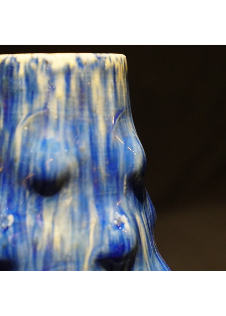 Vazoların yüzeyindeki kabarcık benzeri çıkıntılar ve aşağı doğru akan mavi sırlama tekniği, doğal bir su akışını ya da damlacıklarını anımsatıyor. Lacivertten turkuaza doğru değişen renk tonları, vazoya dinamik ve canlı bir görünüm kazandırırken, her birinin el yapımı olduğunu belli eden eşsiz farklılıklar, ürüne karakter katıyor. Minimalist ve modern dekorasyonlara mükemmel bir uyum sağlayacak olan bu vazolar, estetik ve işlevselliği bir arada sunuyor.