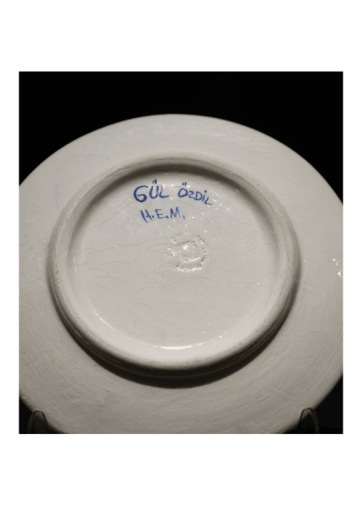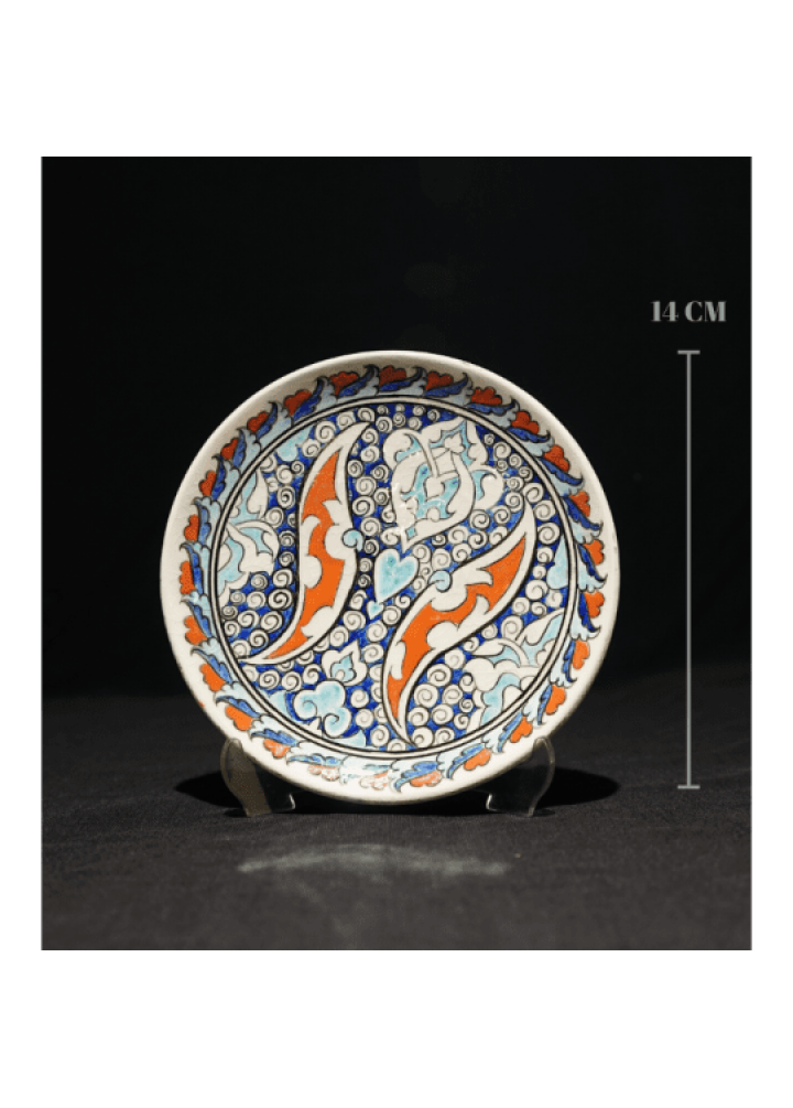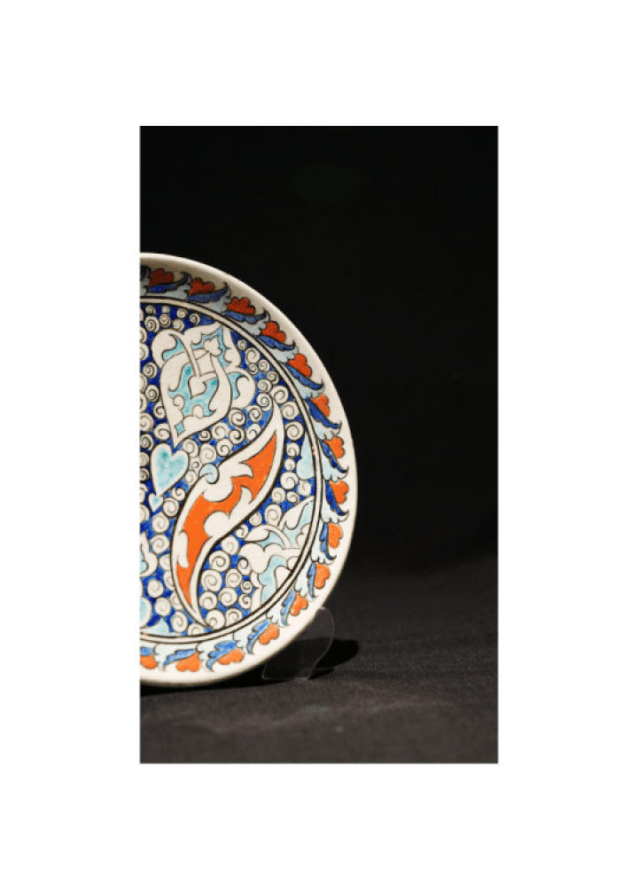 Geçmişin canlı ruhunu günümüze taşıyan bu özel İznik çini tabağı, Osmanlı sanatının dinamik ve estetik bir yansımasıdır. Tabağın merkezindeki büyük, kıvrımlı hatlara sahip stilize yaprak ve bulut motifleri, İznik sanatının karakteristik “saz yolu” tekniğini en çarpıcı haliyle sergiler. Canlı mercan kırmızısı ve parlak kobalt mavisinin cesurca kullanımı, esere adeta bir enerji ve hareket katıyor. Bu renklerin birbirine olan uyumu, izleyiciyi büyüleyen görsel bir şölen yaratır. Bu tabak, evinde sıra dışı ve modern bir dokunuş arayanlar için ideal bir seçimdir.